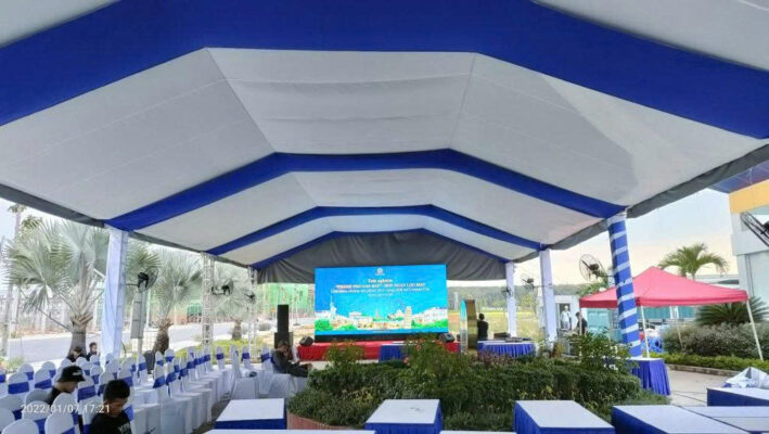 Với kết cấu khung thép chắc chắn, mái bạt chịu lực và diện tích bao phủ lớn, nhà giàn không gian là lựa chọn tối ưu cho các sự kiện ngoài trời như lễ khai trương, hội nghị khách hàng, tiệc tri ân, hội chợ triển lãm…